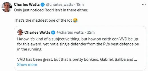 Charles Wattas: Why should van Dijk be selected and Arsenal, the best defensive club in the Premier League, not have a defender? Van Dijk is great, but don't Gabriel, Saliba and Ben Whyte deserve to be included? I just noticed Rodri didn't make the cut either, which is hilarious!