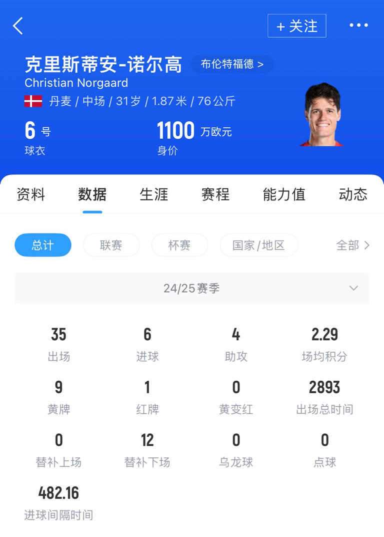 As a key figure in Brentford's consecutive five years of successful relegation avoidance, Norgo played 34 Premier League matches under the current Tottenham manager Thomas Frank last season. The former Fiorentina midfielder has also been a regular in the Danish national team in recent years. Although Norgo just renewed his contract with the team in March this year, it is reported that the player is eager to join the Gunners to compete in the Champions League. Currently, negotiations between the two sides are still ongoing.