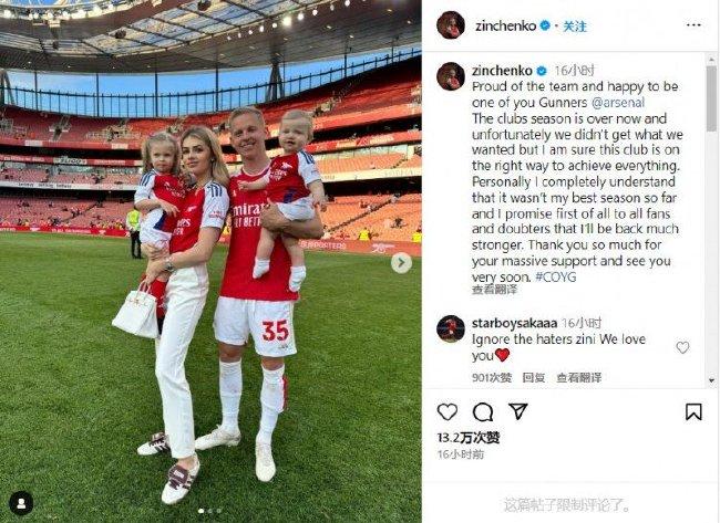 Zinchenko wrote: "Proud of the team, happy to be part of the Gunners, the club's season is over, it's a pity we didn't get what we wanted, but I believe the club is going in the right direction."